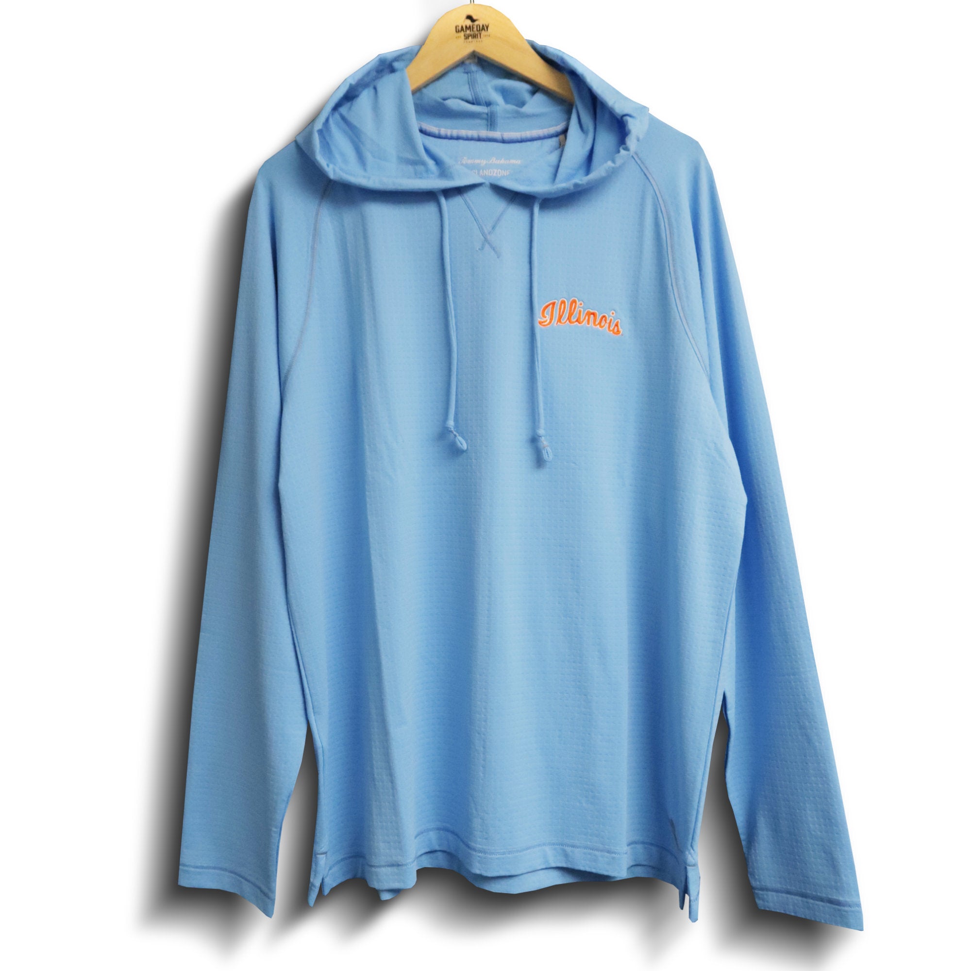 Represent the Illini everywhere you go with this Illinois hoodie! This men's Tommy Bahama pullover comes with a light blue body that has a white-outlined orange script Illinois on the left chest that makes it a must-have. Whether you’re in the stands or walking across campus, this U of I merch will keep your Fighting Illini spirit strong! This is an officially licensed collegiate product.