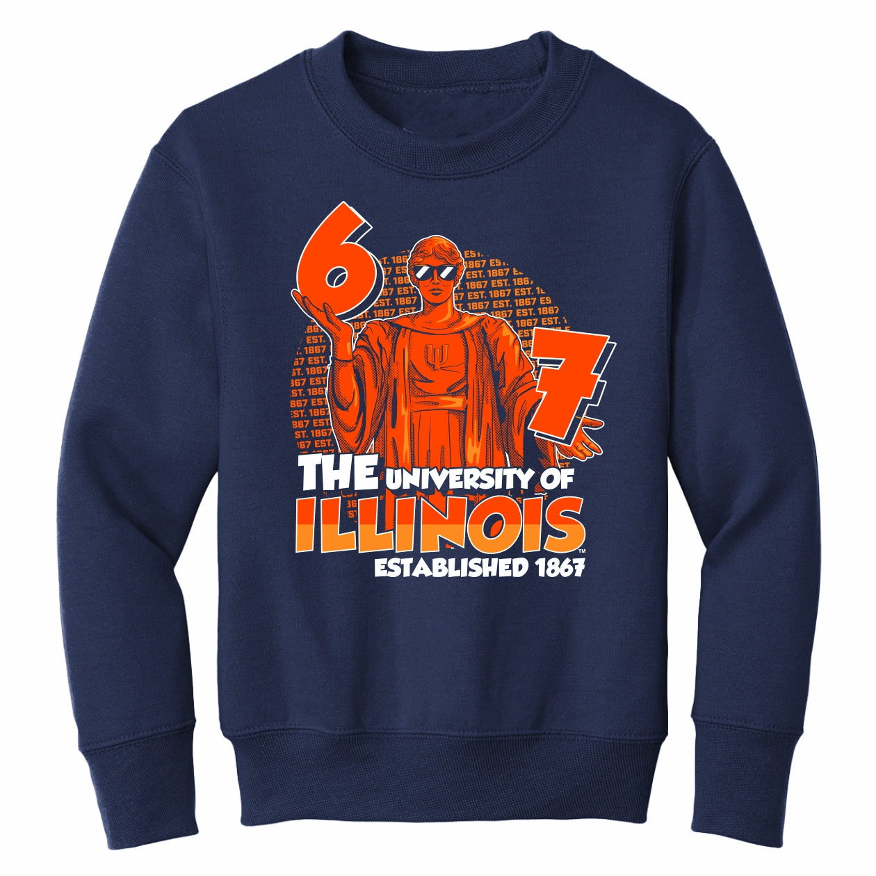 Hail to the orange! This Illinois kids sweatshirt is a great way for your kiddo to show their Fighting Illini spirit! This kids crewneck features a navy fleece body with an orange Alma Mater 67 design that is great for any occasion. Make sure to pick up this sweatshirt to show off your kiddo's Illini pride! This is an officially licensed collegiate product.