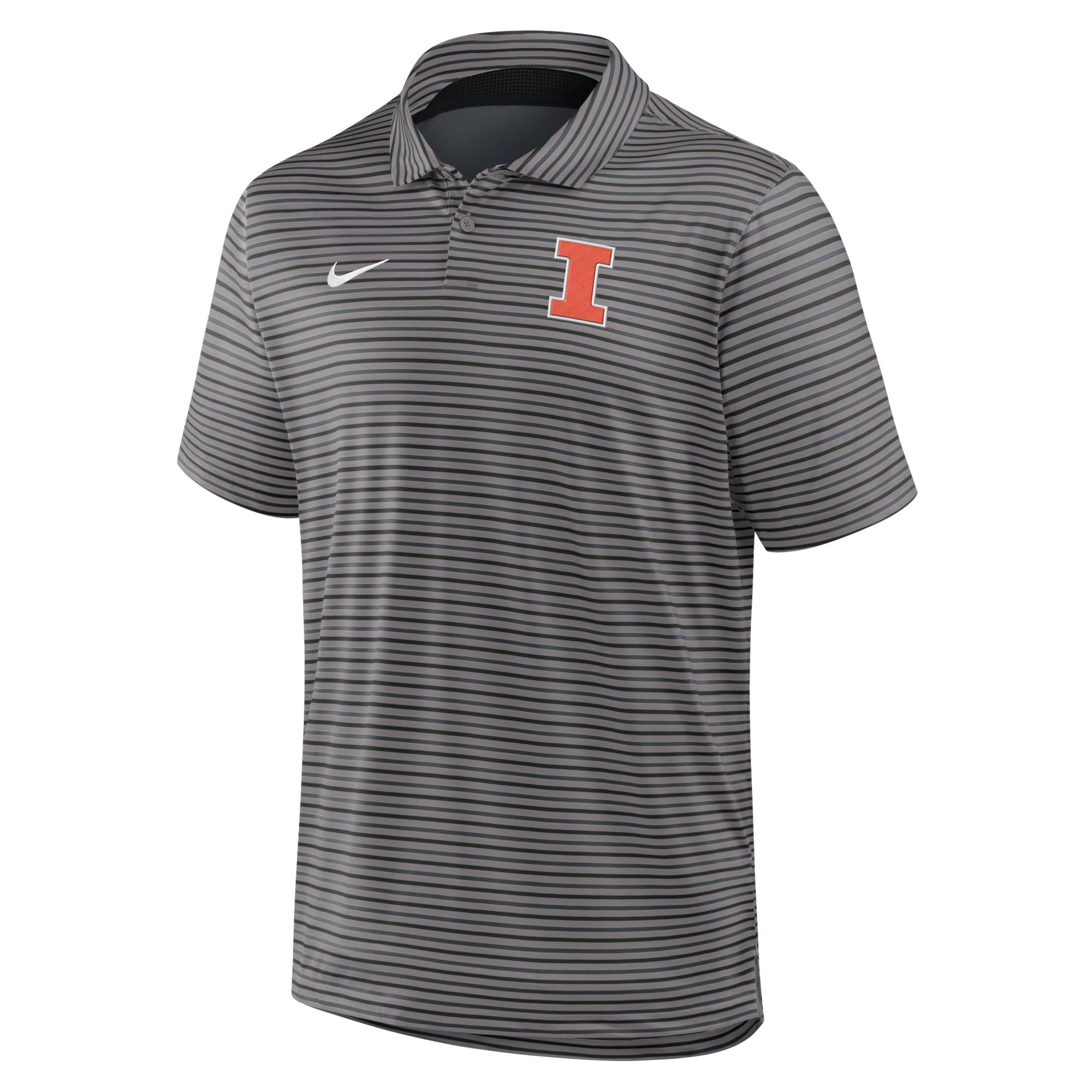 Go Illini! This Illinois polo is perfect for wearing around campus or to games. This new Nike polo features a grey striped body with an orange/white Block I on the left chest. This U of I business casual wear is great for showing your Fighting Illini spirit! This is an officially licensed collegiate product.