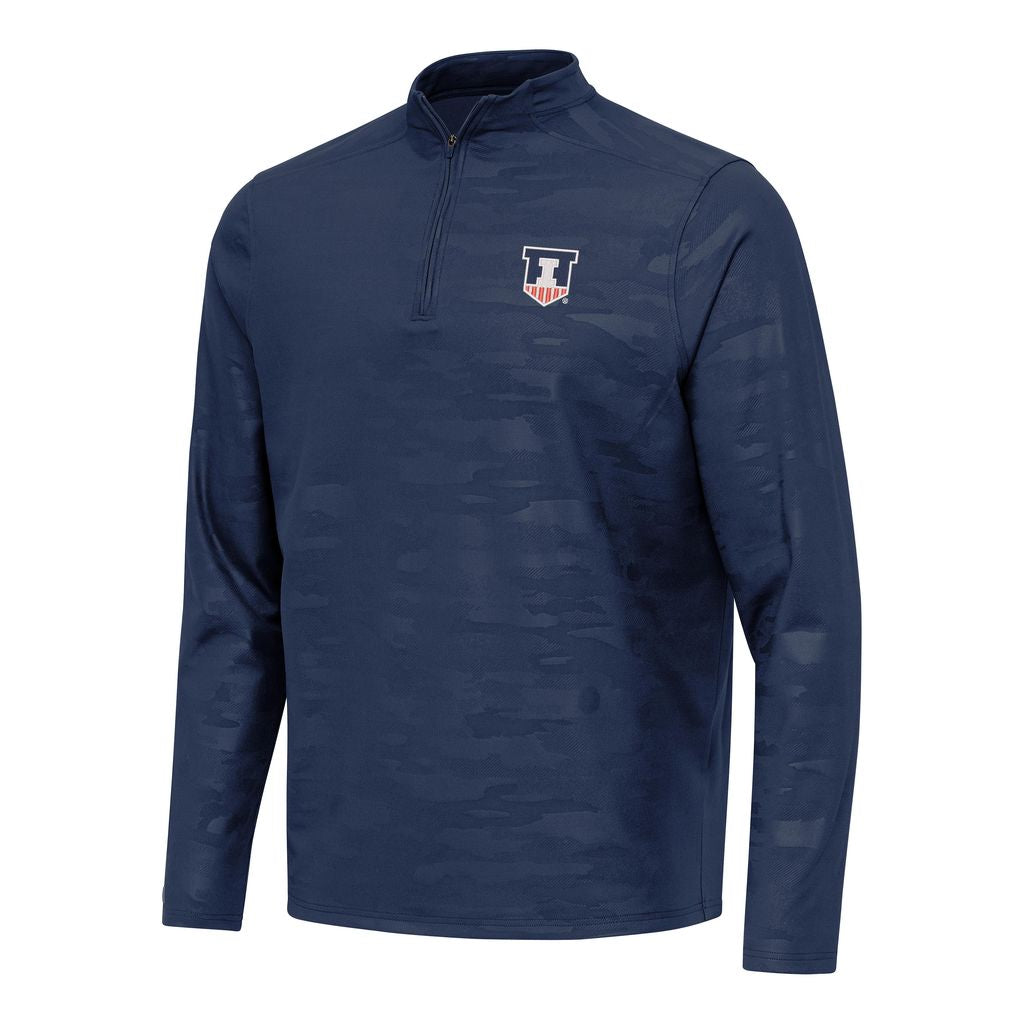 ILL-INI! Gear up for game day with this Illinois quarter-zip. This men's pullover features a subtle navy camo pattern alongside an Illinois shield logo on the left chest that Illini fans will love. Show your school spirit with this Antigua quarter-zip and cheer on Illinois in style! This is an officially licensed collegiate product.