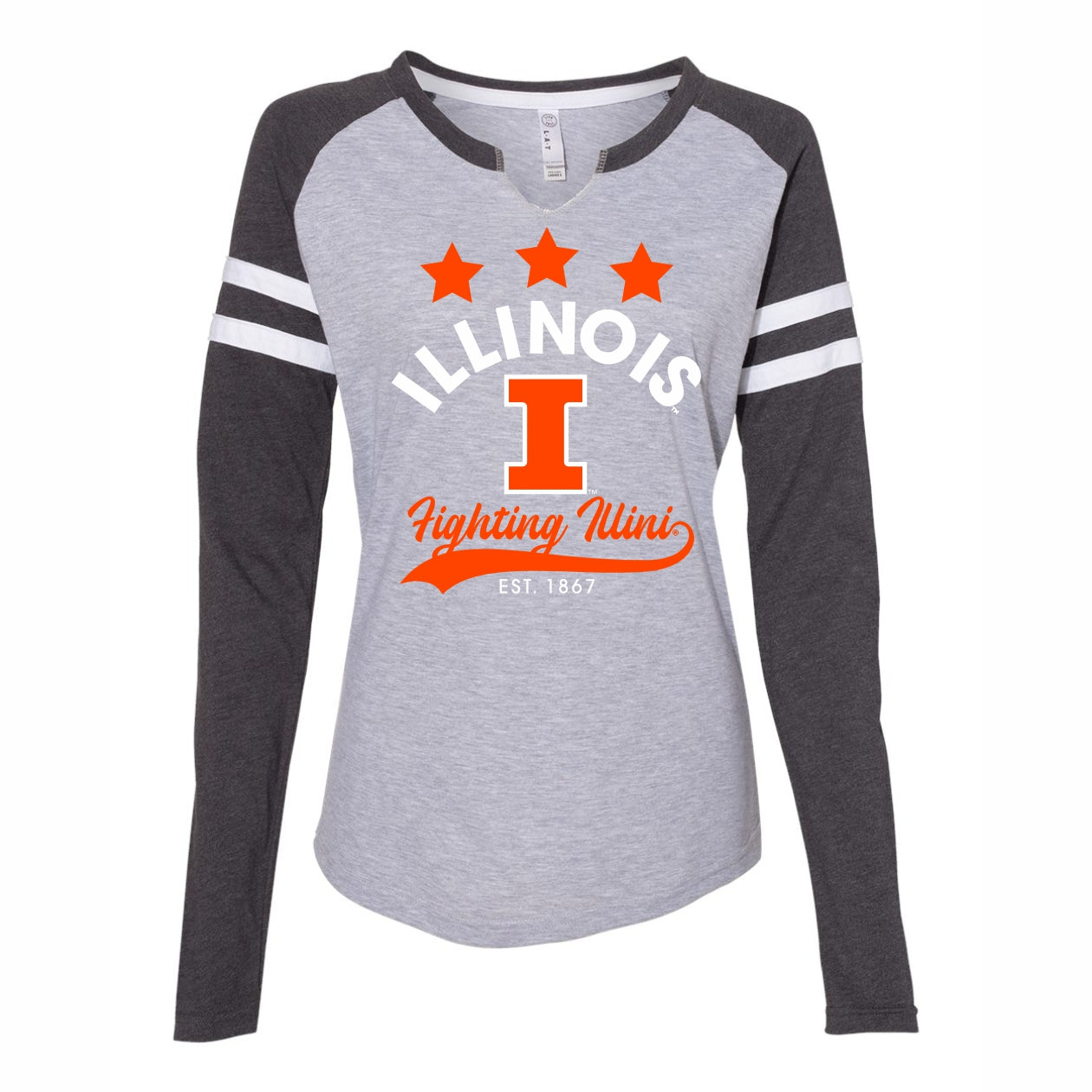 Go Illini! This Illinois women's shirt is perfect for wearing around campus or to games. This long-sleeve tee features a light grey body with dark grey sleeves and an orange/white script Illinois star design on the front. This new Illinois shirt is great for showing your Fighting Illini spirit! This is an officially licensed collegiate product.