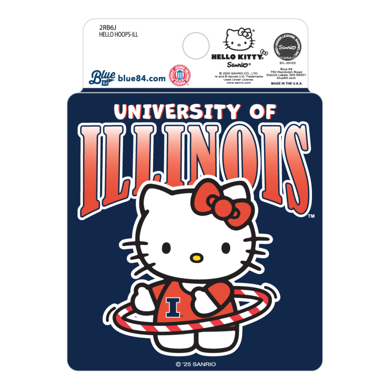 I-L-L! Pick up this Illinois sticker to really show your Illini spirit! This sticker features a blue background with an orange and white Hello Kitty hula hoop design that will make an unforgettable addition to wherever you put stickers! Get one online or in-store today! This is an officially licensed collegiate product.