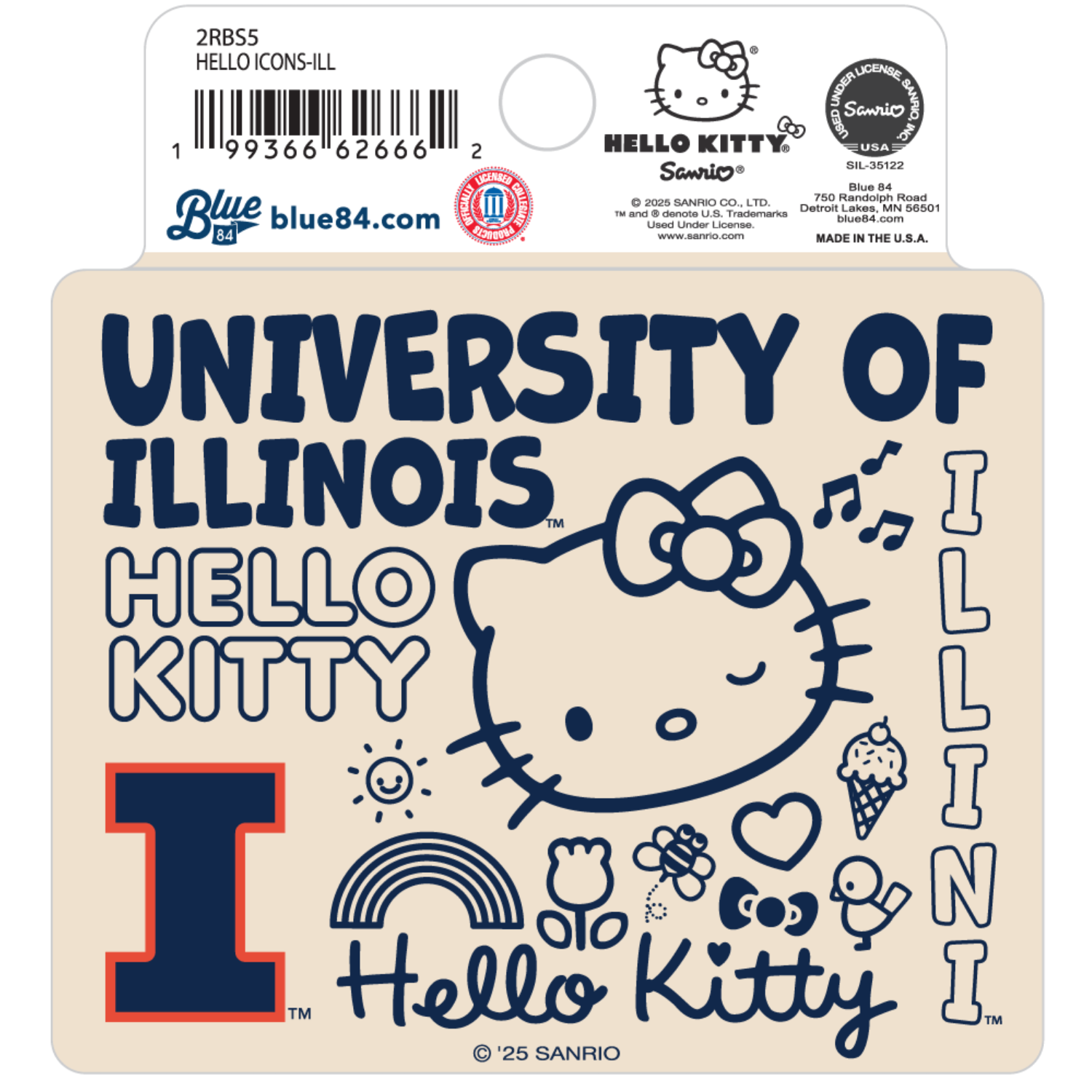 I-L-L! Pick up this Illinois sticker to really show your Illini spirit! This sticker features a tan background with a variety of navy icons and a winking Hello Kitty that will make an unforgettable addition to your Illini collection! Get one online or in-store today! This is an officially licensed collegiate product.