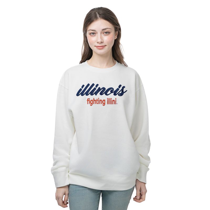 Go Illini! This Illinois sweatshirt is perfect for wearing around campus or to games. This women's pullover crewneck features a white fleece body with a raised script embroidered Illinois and orange Fighting Illini. This new U of I sweatshirt is great for showing your Fighting Illini spirit! This is an officially licensed collegiate product.