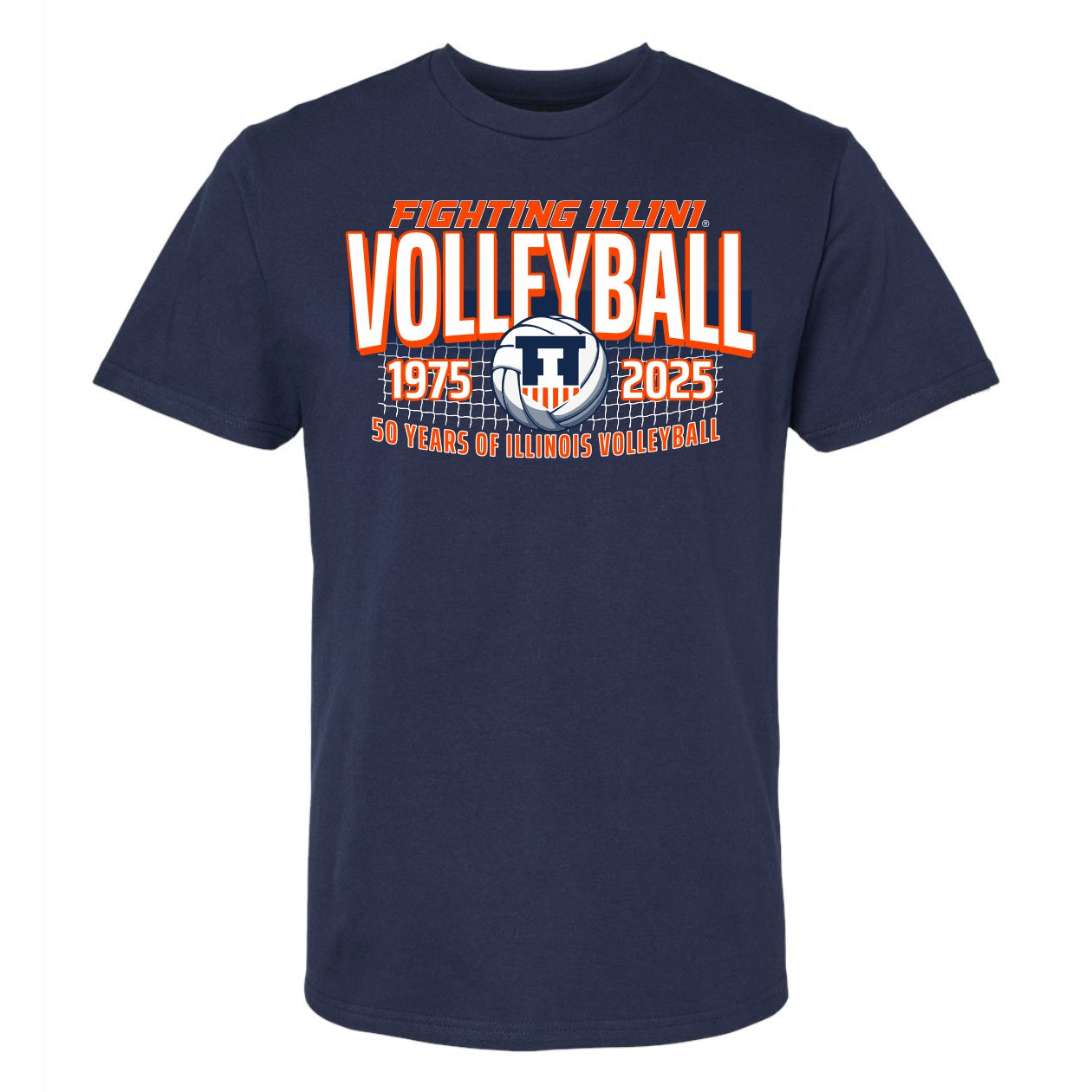 Go Illini! This Illinois Volleyball shirt is perfect for celebrating a historic season! This BOGO tee features a navy body with an orange and white design celebrating 50 years of Illinois Volleyball. This new Fighting Illini merch is great for showing your Illinois spirit! This is an officially licensed collegiate product.