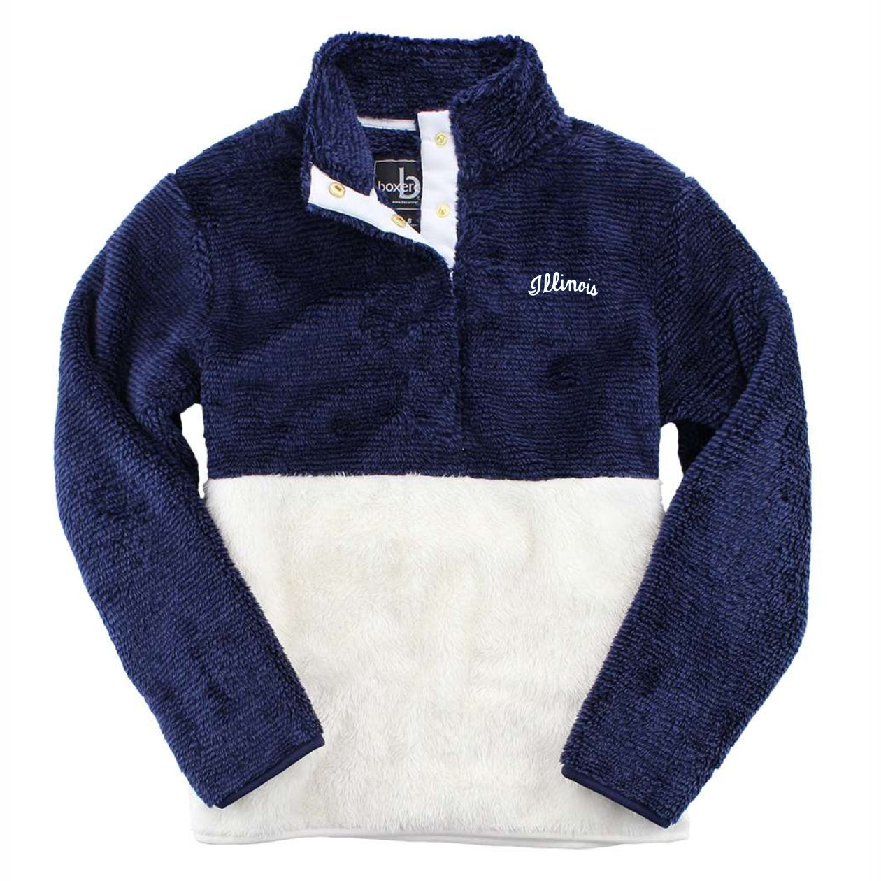 Show your Orange and Blue pride! This Illinois jacket is perfect for any Illini fan. This women's pullover features a navy and white body with a half-snap top and script white Illinois that makes it great for games, tailgates, or campus wear. Don’t miss out on this warm and fuzzy piece to show your Fighting Illini spirit! This is an officially licensed collegiate product.