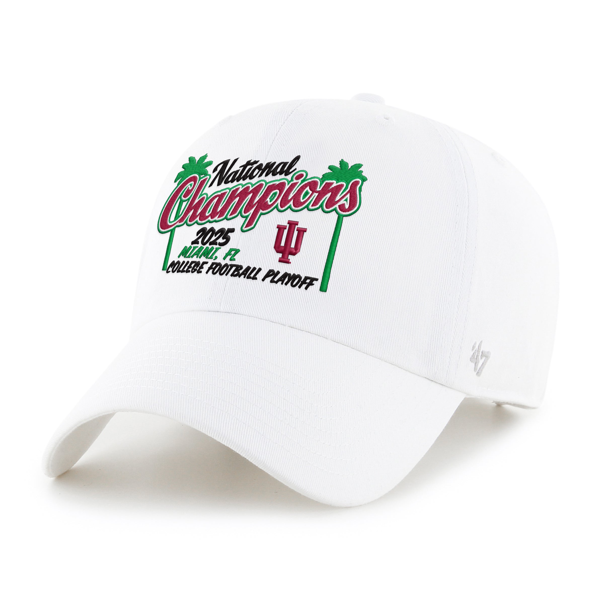 Show your Hoosier pride in this new Indiana Football hat! This new Hoosiers hat features a white body with a black, red, and green 2025 National Champions embroidery on the front perfect for showing off around campus and celebrating the team's historic season. Impress your friends with this IU CFP Champs merch and make them wish they had one too! This is an officially licensed collegiate product.
