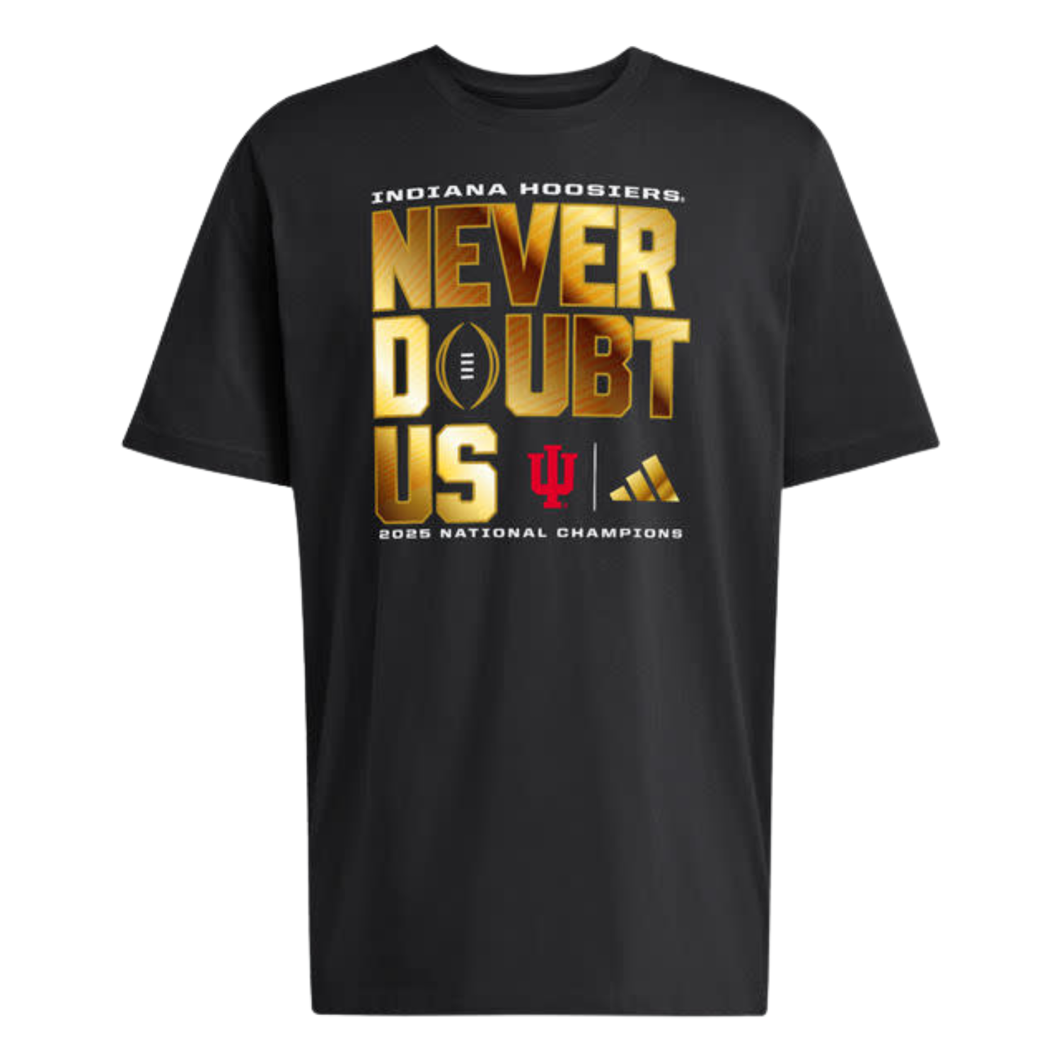Go IU! Fight! Fight! Fight! This Indiana Football National Champs tee will show that you are a true fan and is perfect for celebrating the team's historic win! This Adidas tee features a black body with a gold "Never Doubt Us" with a white "Indiana Hoosiers 2025 National Champions" around it. Make sure to get this Indiana CFP Champs merch today! This is an officially licensed collegiate product.