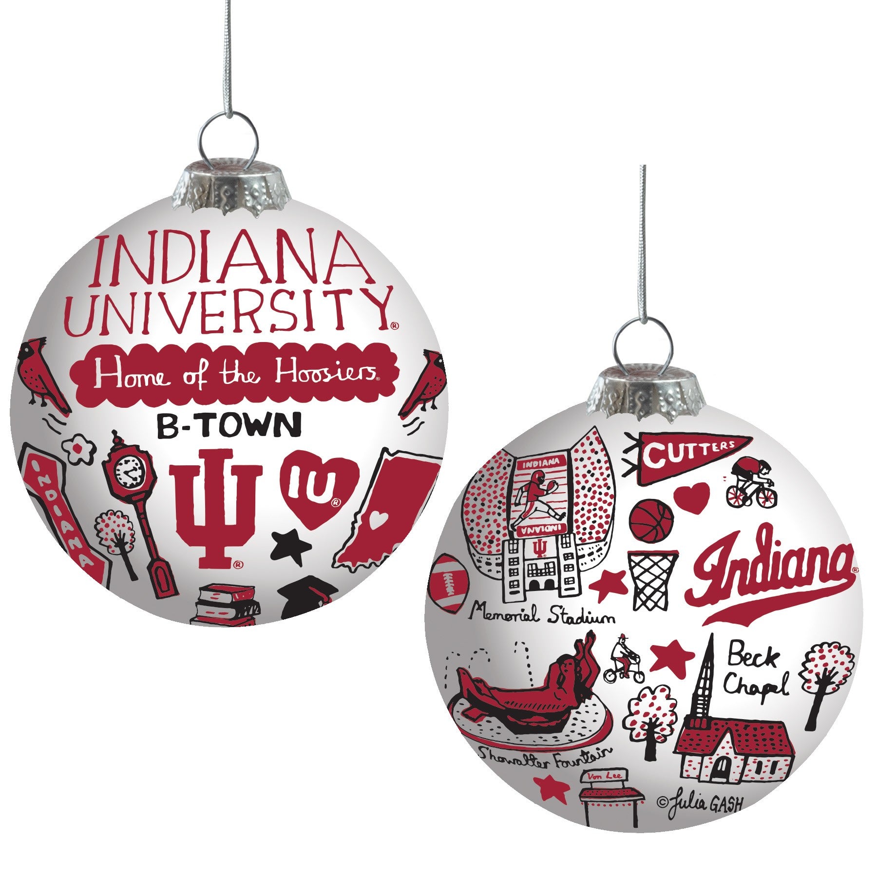 Show your Hoosier pride with this new Indiana ornament! This ornament features a round white body with a variety of red/black IU logos scattered around perfect for showing your Hoosier pride. Impress your friends with this IU ornament and make them wish they had one too! This is an officially licensed collegiate product.