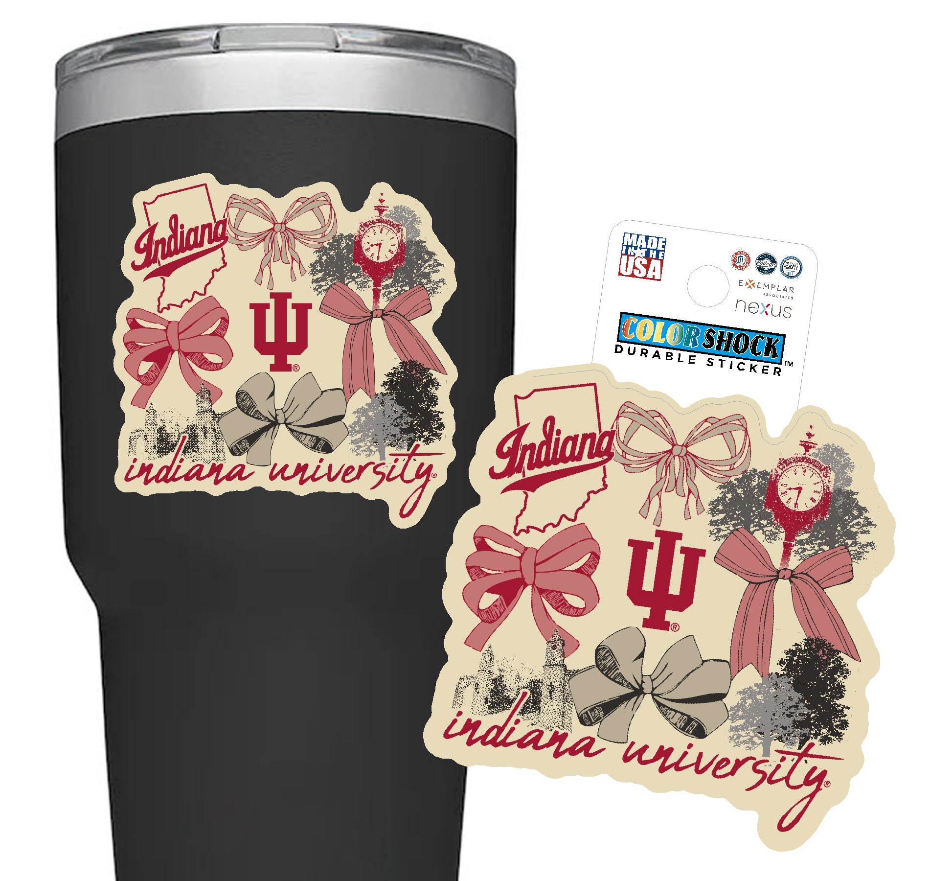 Show your Hoosier pride with this new Indiana sticker! This sticker features a tan background with a variety of red/grey bows and campus landmarks that will make a great addition to your Indiana collection. Make sure to pick up this new sticker in-store or online! This is an officially licensed collegiate product.