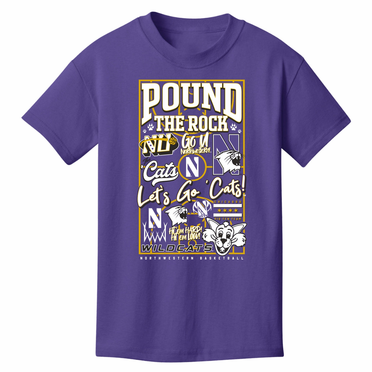 Go NU! This Northwestern t-shirt will show your kiddo's Wildcat pride! This BOGO tee features a purple body with a gold and white "Pound the Rock" desgin that is perfect for your kiddo to wear to games! Shop the Official Team Store of Northwestern Athletics for Northwestern apparel or gifts! This is an officially licensed collegiate product.