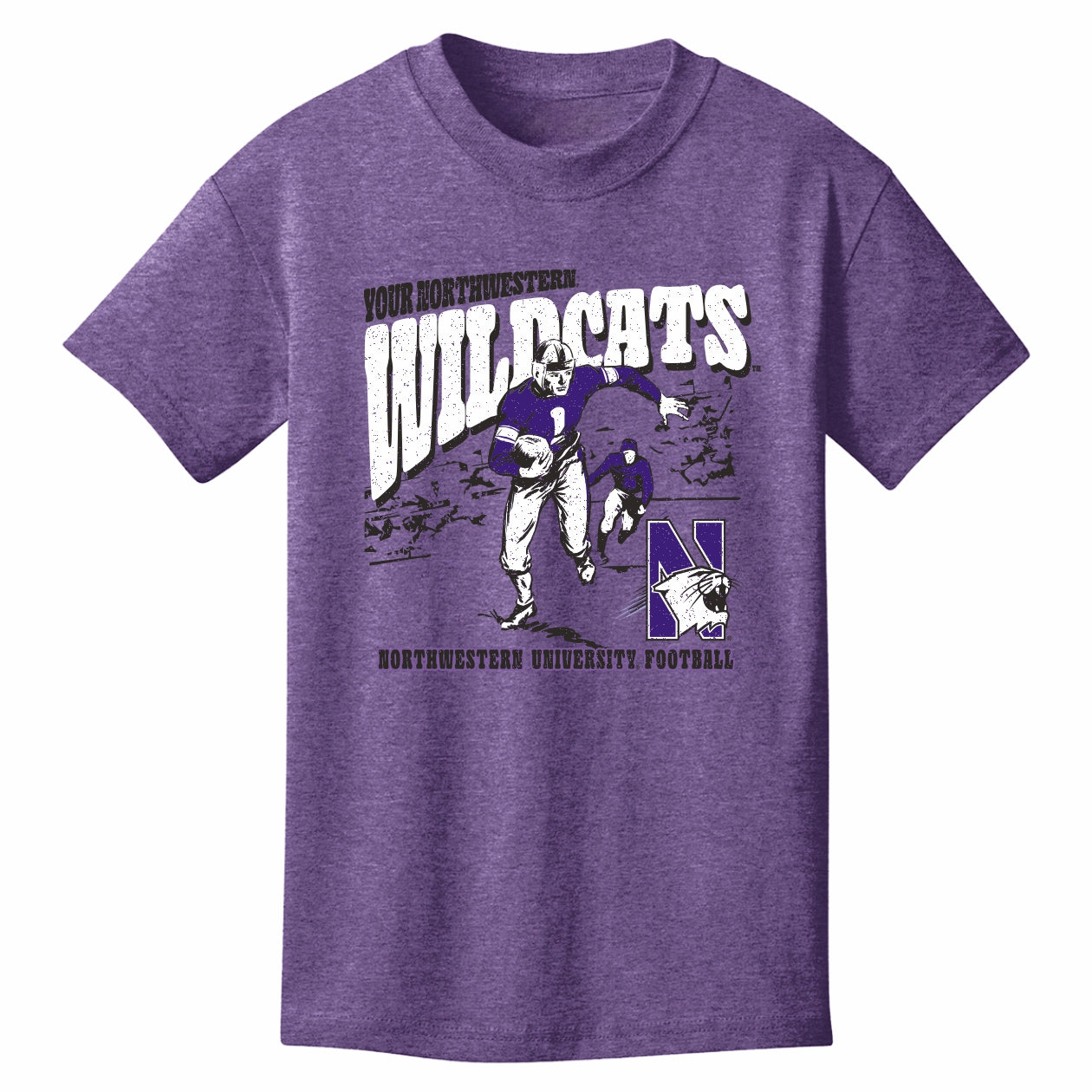 Go NU! This Northwestern Football shirt will show your kiddo's Wildcat pride! This BOGO tee features a purple body with a black/white vintage football player design that is perfect for wearing to games! Shop the Official Team Store of Northwestern Athletics for Northwestern apparel or gifts! This is an officially licensed collegiate product.