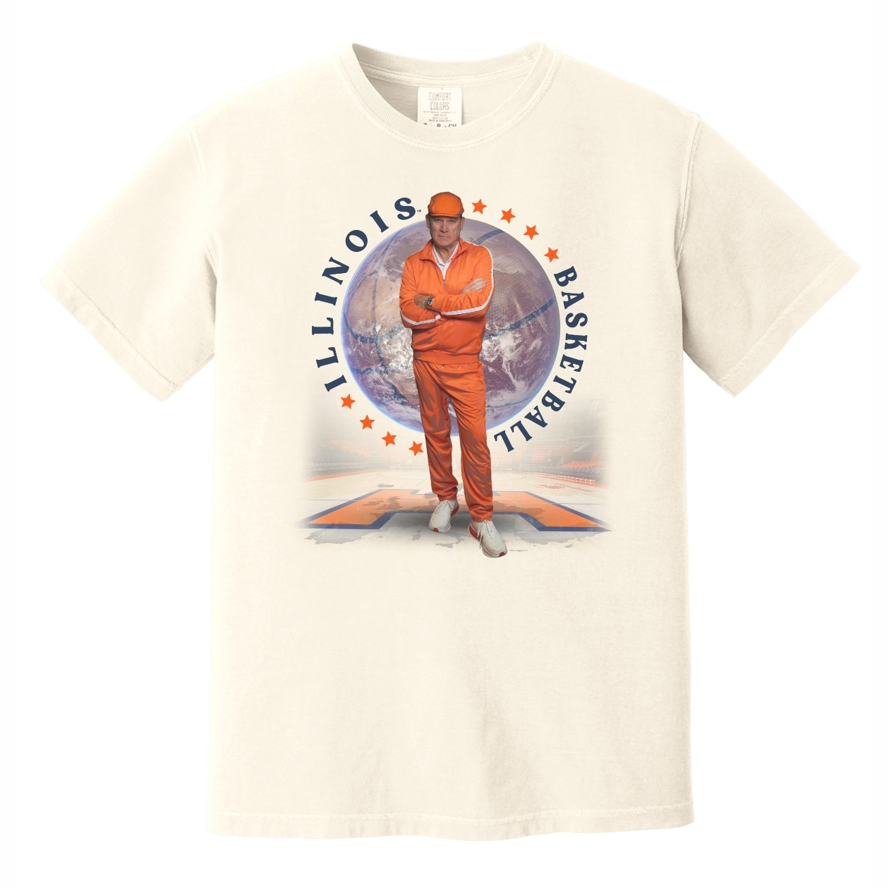 Go Illini! This Illinois Basketball tee is perfect for wearing around campus or to games. This Brad Underwood merch features an image of Brad wearing an orange tracksuit while standing in front of a globe/basketball. This Fighting Illini Basketball shirt is great for showing your Illinois spirit! This is an officially licensed collegiate product.